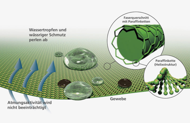 ecorepel® nutzt eine hochfunktionelle, dauerhaft geruchslose Hightech-Finish-Beschichtung, die den natürlichen Schutzmechanismus von Pflanzen imitiert. Die Ausrüstung legt sich in einem dünnen Film spiralförmig um die einzelen Fasern, wodurch die Oberflächenspannung herabgesetzt wird. Dies erzeugt den abweisenden Effekt, der Wassertropfen und wässrigen Schmutz von der Textiloberfläche abperlen lässt. Die Atmungsaktivität wird nicht beeinträchtigt, der Griff bleibt angenehm weich und die Textilien bleiben trocken und sauber.